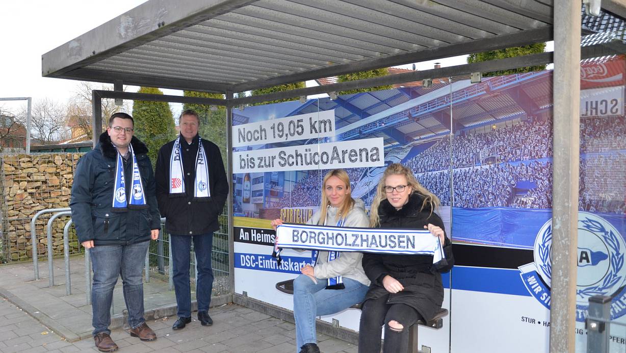 „Das gilt sogar für Fans, die mit dem Haller Willem aus Osnabrück anreisen“, sagt Heidmann. Auch ein kleiner technischer Fehler, durch den das Angebot der kostenlosen Beförderung nur für Gruppen und nicht für Einzelpersonen galt, ist inzwischen behoben worden, wusste Maxine Brückner, die als Vertreterin von Arminia Bielefeld bei der Vorstellung des neugestalteten Wartehäuschens gestern Nach-mittag dabei war.