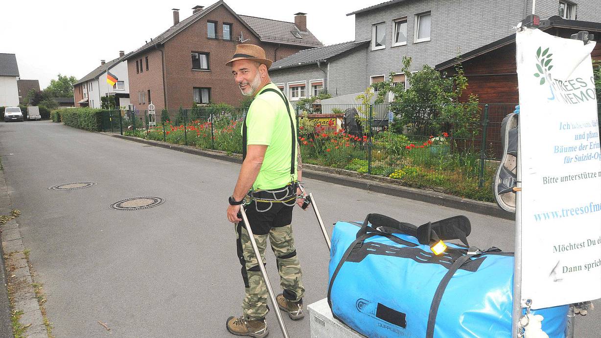 Kurz nach Mittag muss Mario Dieringer weiter. Er umarmt Jutta Opiela und Fritz Bude, dankt für die Gastfreundschaft. Bude hat ihm einen Anhänger gebaut, auf dem Dieringer sein 50 Kilogramm schweres Gepäck besser transportieren kann als auf dem Rücken. Auf dem Banner hinten steht »Bitte unterstütze mich«. „Nach links oder nach rechts?", fragt Dieringer, als er aus der Einfahrt am Westbarthausener Hasenweg tritt. „Nach links", sagt Bude. Und Mario läuft.