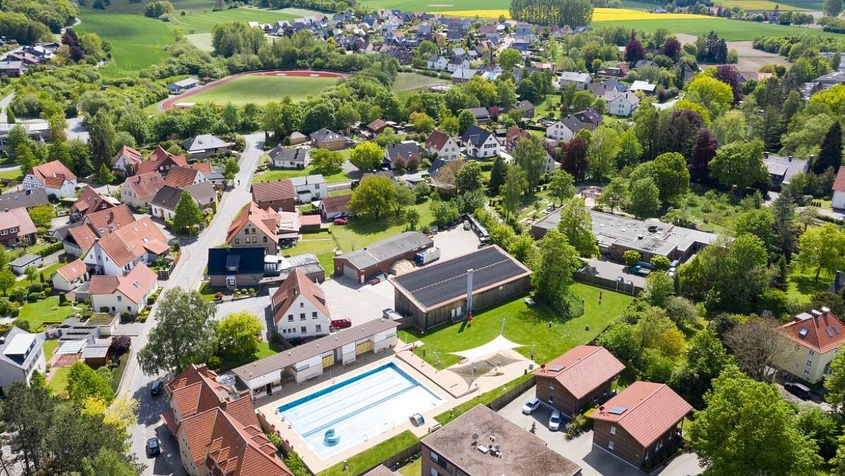 In Borgholzhausen - das Luftbild zeigt vorne das Bürgerzentrum und das Freibad - leben konstant mehr als 9.000 Menschen. | © Ulrich Fälker