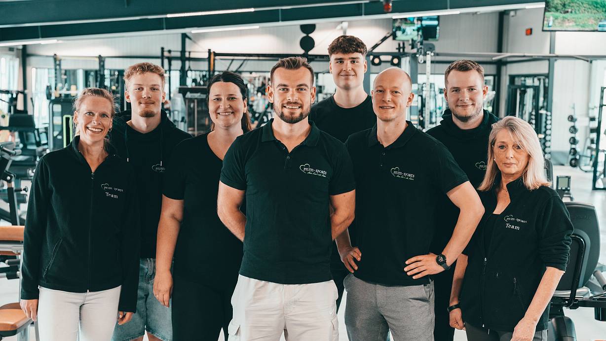 Nadine Glaesing (v. l.), Joe Flottmann, Leonie Wolnik, Marcel Rohde, Finn Fechtel, Yannick Hansel, Maurice Deppe, Heike Rodefeld bilden das neue Team im „Pium Sports“ in Borgholzhausen. | © kickdown.media