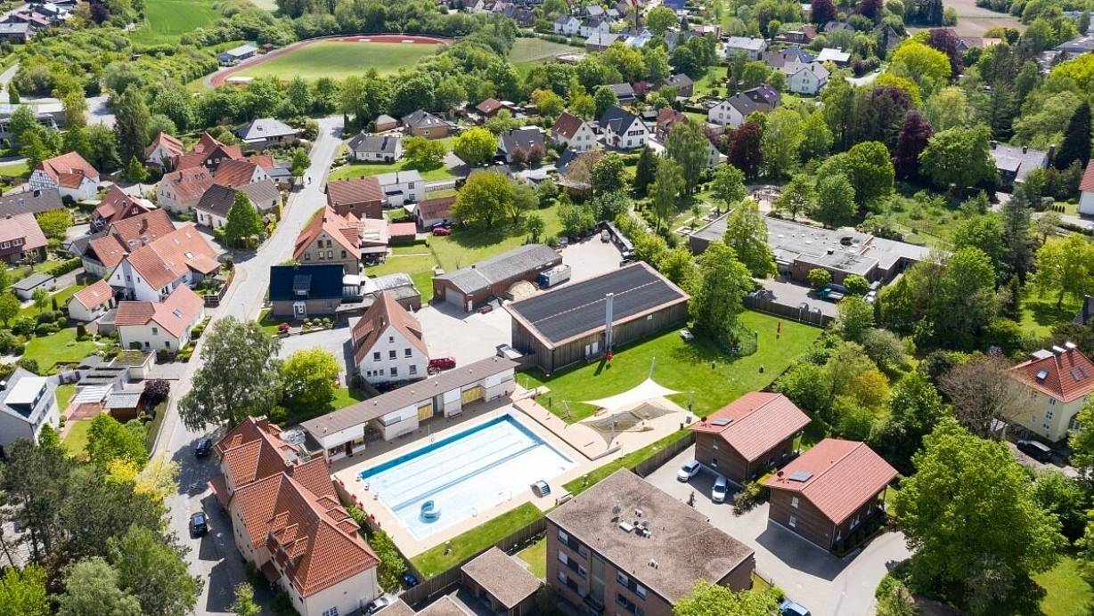 In Borgholzhausen – das Luftbild zeigt vorne das Bürgerzentrum und das Freibad – leben laut der einen Statistik mehr als 9.000 Menschen, laut der anderen weniger als 9.000. | © Ulrich Fälker
