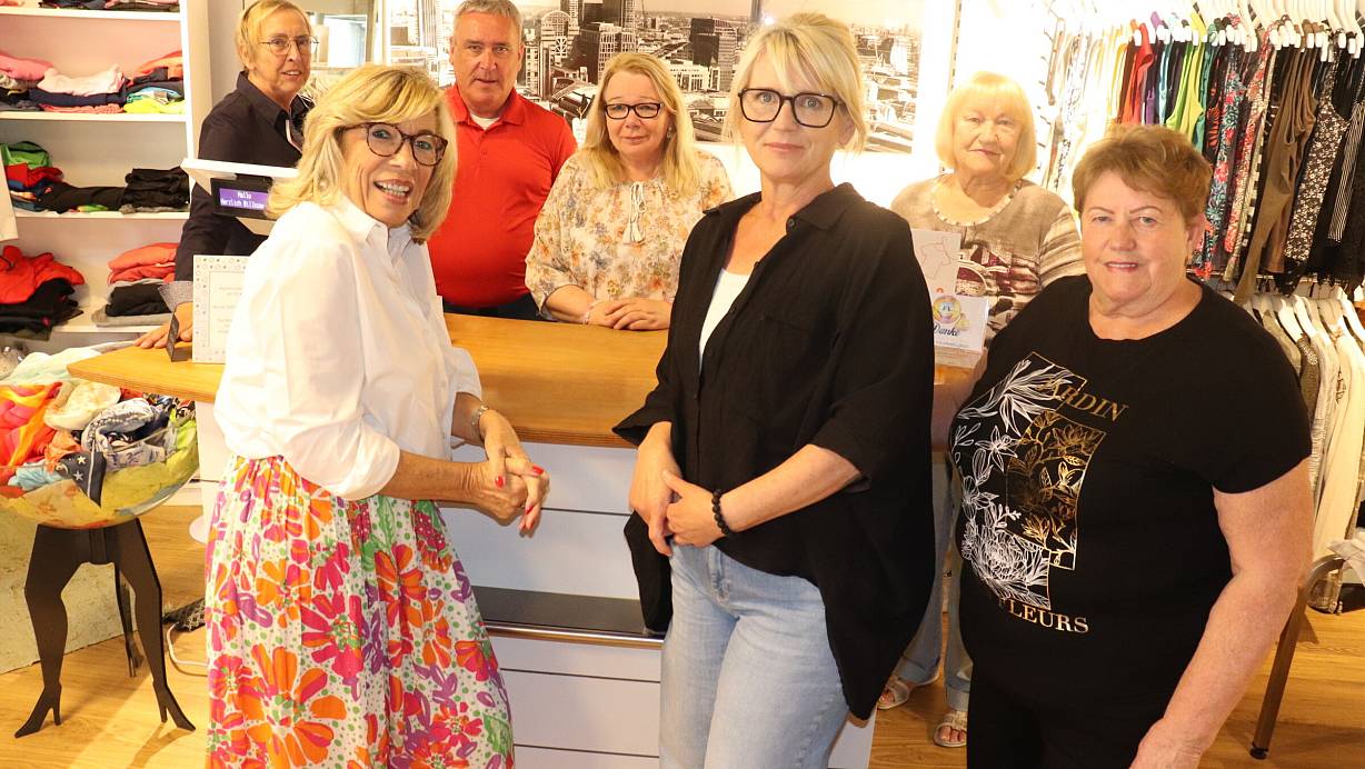 Ein Teil des ehrenamtlichen Teams im Secondhand-Laden „Fair kaufen“: Elke Middeljans (v.l.), Evi Hemmen, Torsten Schild, Martina Guschok, Margitta Varwig, Hanna Krukovets sowie Daria Husak. | © Alexander Heim