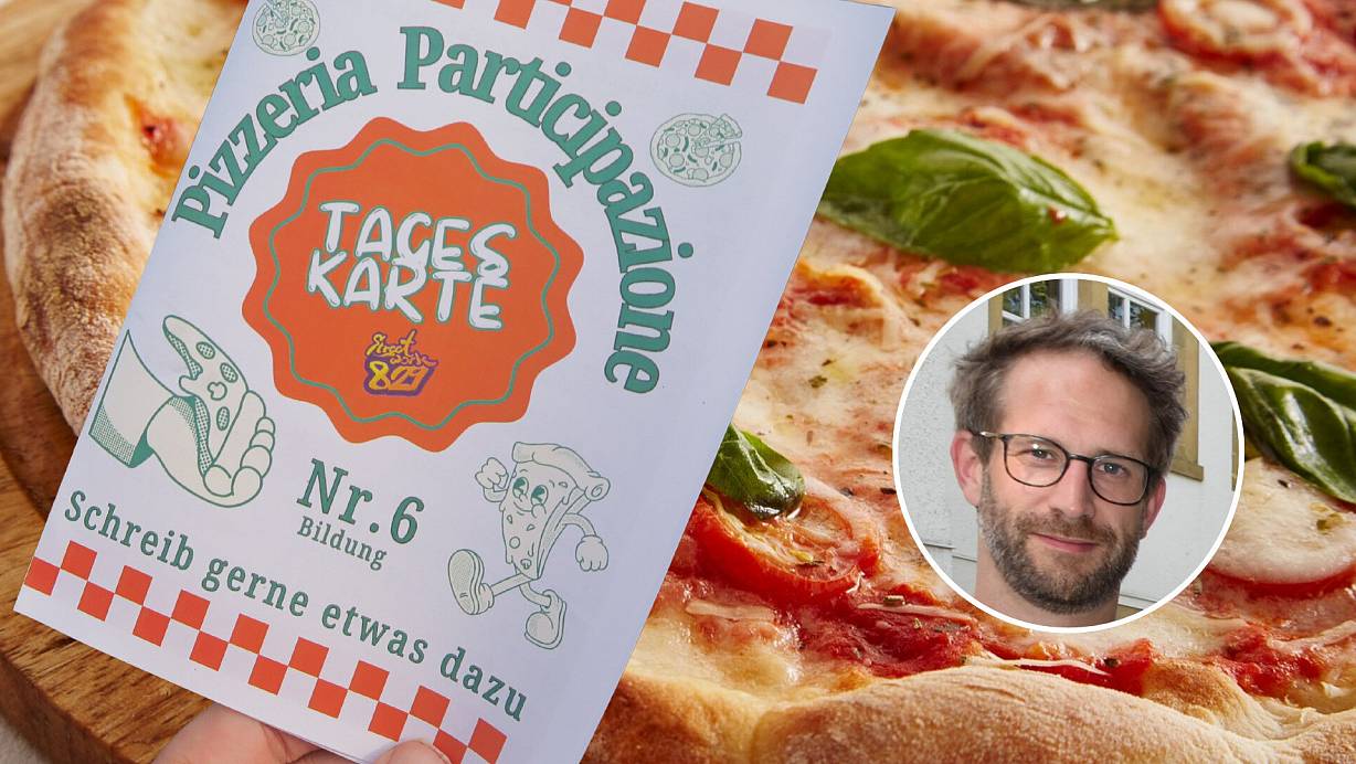 Die "Pizza Partizipazione" von Marcel Kay (kleines Bild) kommt bei Jugendlichen und Kindern gut an. Bevor es eine Gratis-Pizza gibt, füllen die Gäste einen Fragebogen aus. | © Fotos: Alexander Heim / Birgit Nolte / Pixabay