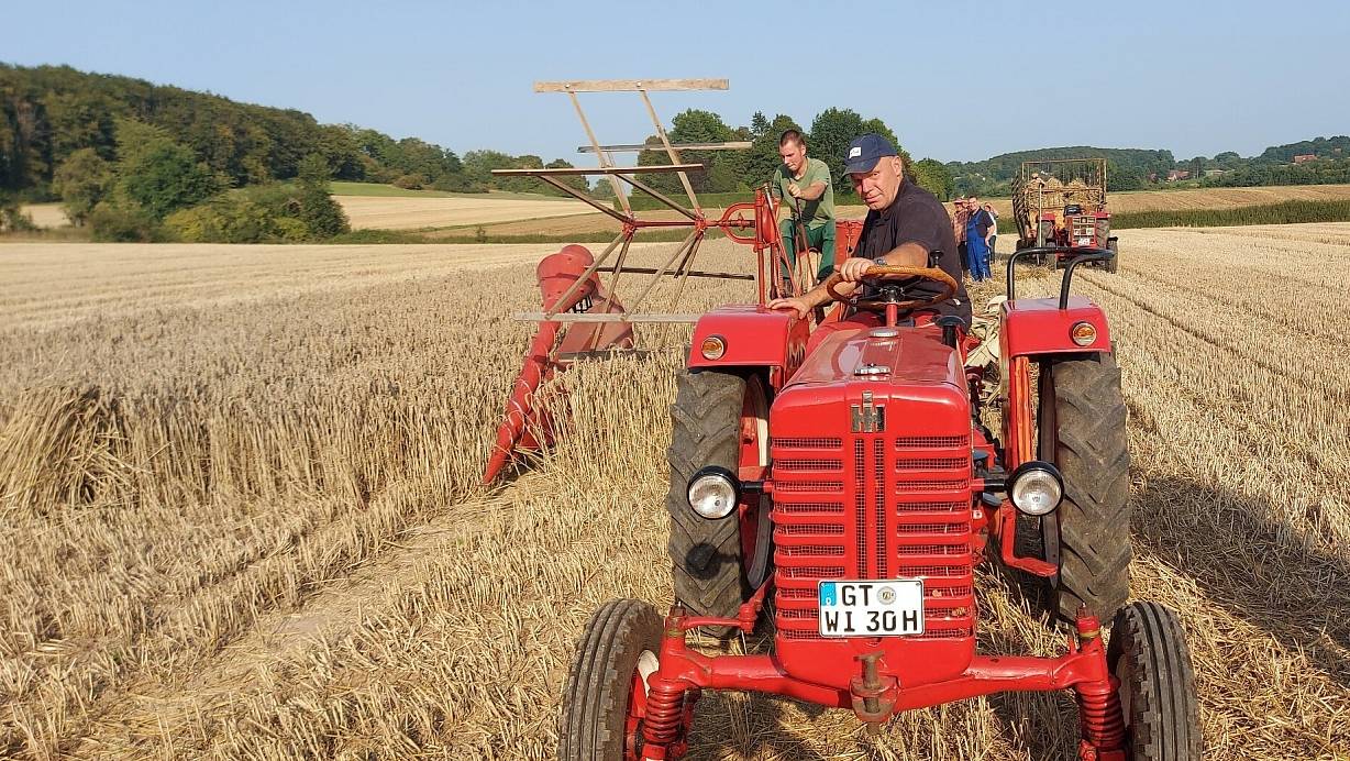Auch Bürgermeister Dirk Speckmann greift auf dem Hof Kemner zur Forke und lädt einige Garben auf. Den Trecker fährt Gastgeber Jürgen Kemner-Prange, Sohn Markus Prange sitzt hinten auf dem Mähbinder. Beim Traktor handelt es sich um einen McCormick aus den frühen 1960er Jahren. Ein Aufkleber mit der Aufschrift „Tiede“ klebt noch auf ihm. Die Firma für Landmaschinentechnik aus Werther gibt es seit mehr als 20 Jahren nicht mehr.