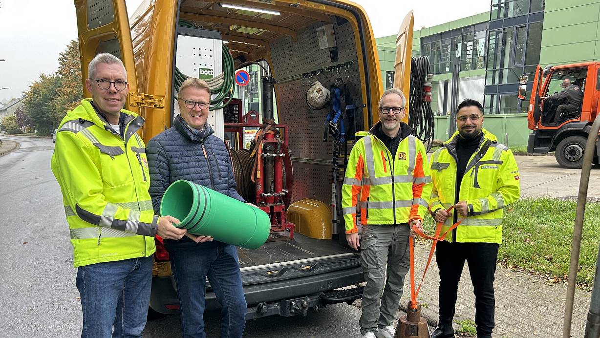 Auch Fred Peters, Borgholzhausens Abteilungsleiter für Planen und Bauen, sowie Matthias Zeh als Niederlassungsleiter der mit dem Bau beauftragten Firma Diringer & Scheidel Rohrsanierung aus Gelsenkirchen sind vor Ort, um Bürgermeister Dirk Speckmann und der Presse die Besonderheiten des laufenden Bauvorhabens zu erklären. Dabei komme nämlich ein spezielles Verfahren zum Einsatz, was eine Sanierung ohne großes Aufsehen ermögliche: das sogenannte TIP-Verfahren. „TIP steht für Tight-in-Pipe“, sagt Peters, also: eng im Rohr.