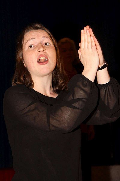 Um ihm Mut zu machen, tritt nun eine Folkwang-Gesangsstudentin und Kinderstimmbildnerin am Essener Theater in Aktion. Laura Kriese, die früher selbst im hiesigen Kinderchor mitgesungen hat, animiert die Schüler zum Mitsingen im Chor. Selbst komponierte und getextete Lieder von Anna-Lena Schütte werden angestimmt und 300 Stimmen bescheren dem zagenden Finn die nötige Courage.