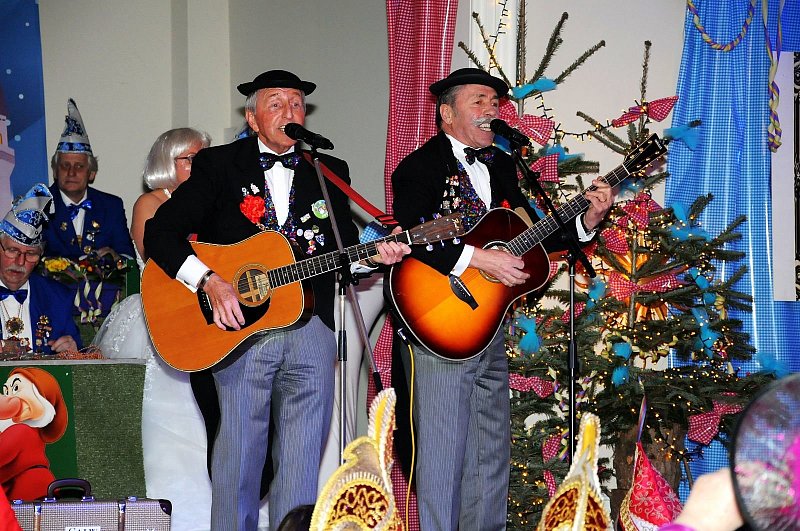 Verzichten mussten die Jecken auf die Tanzvorführung der Kindergruppe des TV Künsebeck, die ihren Auftritt aus Krankheitsgründen abgesagt hatte. Das tat der Stimmung aber keinen Abbruch und so zündeten die „Zwei Lausbuben“ die ersten Stimmungsraketen nach dem Einmarsch des Elferrates mit deftigen Witzen und krachenden Akkorden. Eingangs erwähnte partielle Amnesie hatten Uwe und Manfred übrigens auch bei Politikern ausgemacht, die schon kurz nach der Wahl nicht mehr wissen, was sie ihren Wählen zuvor versprochen hatten. Bezugnehmend auf die Ereignisse bei der Wahl in Thüringen trällerte das Duo: „Immer nach dem Wahltag fehlt die Erinnerung und jeder dreht es sich so, wie er es braucht.“