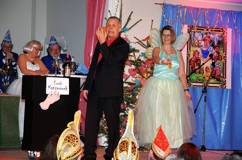 Danach verstand es Frank Katzmarek meisterhaft, seine Zauberkunststücke mit einem komödiantischen Sprüche-Feuerwerk und weiblichen Assistentinnen, die er kurzerhand aus dem Publikum verpflichtete, zu umspielen und die Gäste mit seinen Tricks zu verblüffen. So schaffte es Diana mit seiner Hilfe, ein Frühstücksei verschwinden zu lassen, und Cordula einen Knopf von unsichtbarer Hand anzunähen.