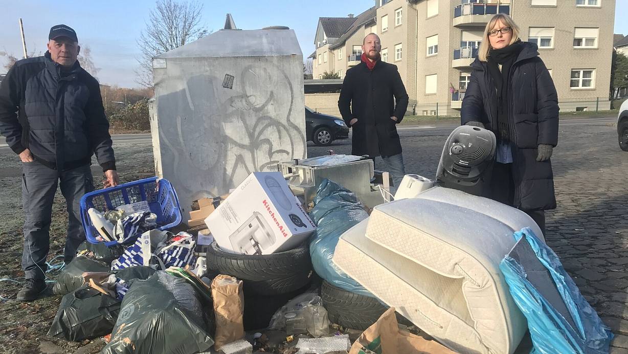 Der illegal entsorgte Müll einer einzigen Woche. Bauhofsleiter Thomas Schürmann (v.l.), der Leiter der Abteilung Umwelt und Klimaschutz, Felix Hüttl und die Umweltbeauftragte der Stadt Janine Thannhäuser rufen die Bevölkerung zur Mithilfe auf. | © Heiko Kaiser
