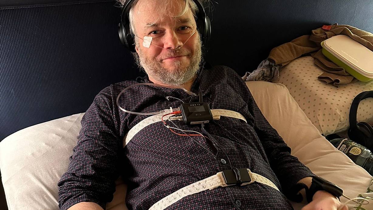Verkabelt wie ein Astronaut: Tim Braune mit einem ambulanten Schlaflabor, das per Post kommt. Viele Long-Covid-Patienten haben schwere Schlafstörungen. | © Familie Braune