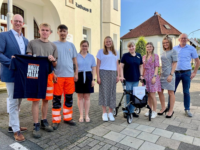Der 1. August ist auch bei der Stadt Halle traditionell der Tag, an dem die neuen Auszubildenden starten. In diesem Jahr decken die neuen Azubis die ganze Vielfalt des städtischen Arbeitsangebotes ab: Annie Janzen absolviert eine Ausbildung zur Verwaltungsfachangestellten, Alex Neufeld wird Gärtner und Olga Ollo Erzieherin. „Sie sind der Beweis, dass wir ein extrem vielseitiger Arbeitgeber sind, der für ganz viele Berufswünsche und Karrieren ein attraktives Angebot bietet“, begrüßte Bürgermeister Thomas Tappe die neuen Mitarbeitenden. Während Annie Janzen ganz neu zum Team der Stadtverwaltung stößt, haben Alex Neufeld und Olga Ollo bereits Erfahrungen gesammelt. Neufeld gehört schon seit Jahresbeginn zum Team des Bauhofes und wird nun von Gärtnermeister Marcel Hampel ausgebildet. Ollo arbeitete bisher als Alltagshelferin in der Kita Stockkämpen und absolviert nun eine praxisintegrierte Ausbildung zur Erzieherin.Mit dem Start der Ausbildung der drei neuen Azubis enden gleichzeitig die Lehrjahre ihrer Vorgänger Sarah Eggert (Verwaltungsfachangestellte) und Marian Liman (Straßenwärter). Beide werden nach guten Leistungen übernommen und gehören ab sofort zum Team der Stadtverwaltung.