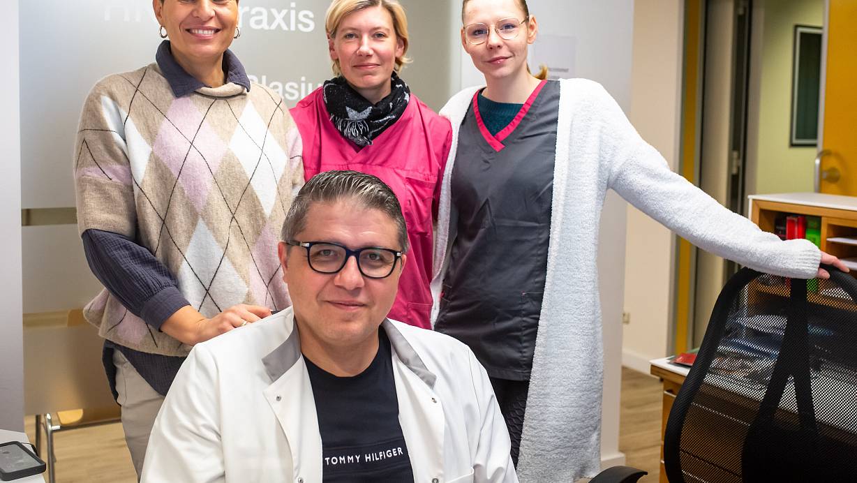 Vesna Vesovic (h. v. l.), Julia Sommer-Niemand und Alessa Wallacher unterstützen Ahmad Bilal in seiner neuen Praxis in Halle. | © Andre Schneider