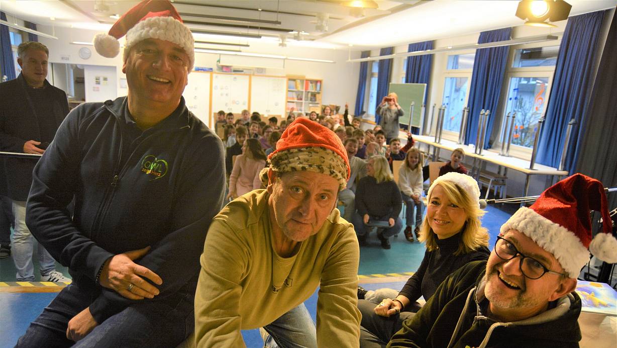 Halle. 70 Kinder sitzen still auf ihren Stühlen und blicken gebannt zur Bühne. Dort haben Tina Ruland, Ingo Naujoks und Jochen Vahle auf einem weißen Sofa Platz genommen. Sie tragen rote Zipfelmützen. Lebhaft, unterhaltsam und weihnachtlich ist ihr Programm.