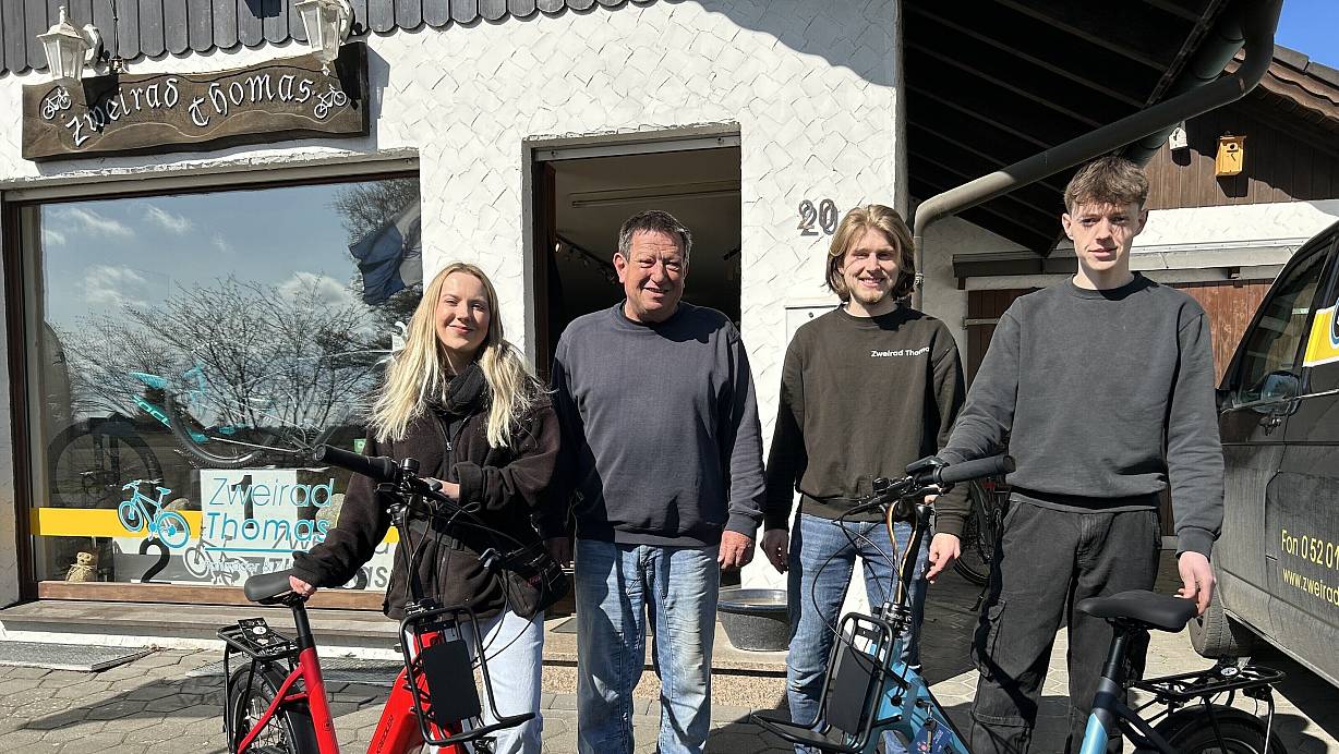 Christin Solito (v.l.), Thomas Plaßmann, Jan Blomeier und Jonah Wötzel von "Zweirad Thomas" freuen sich auf den Beginn der Fahrrad-Saison. | © Tobias Barrelmeyer