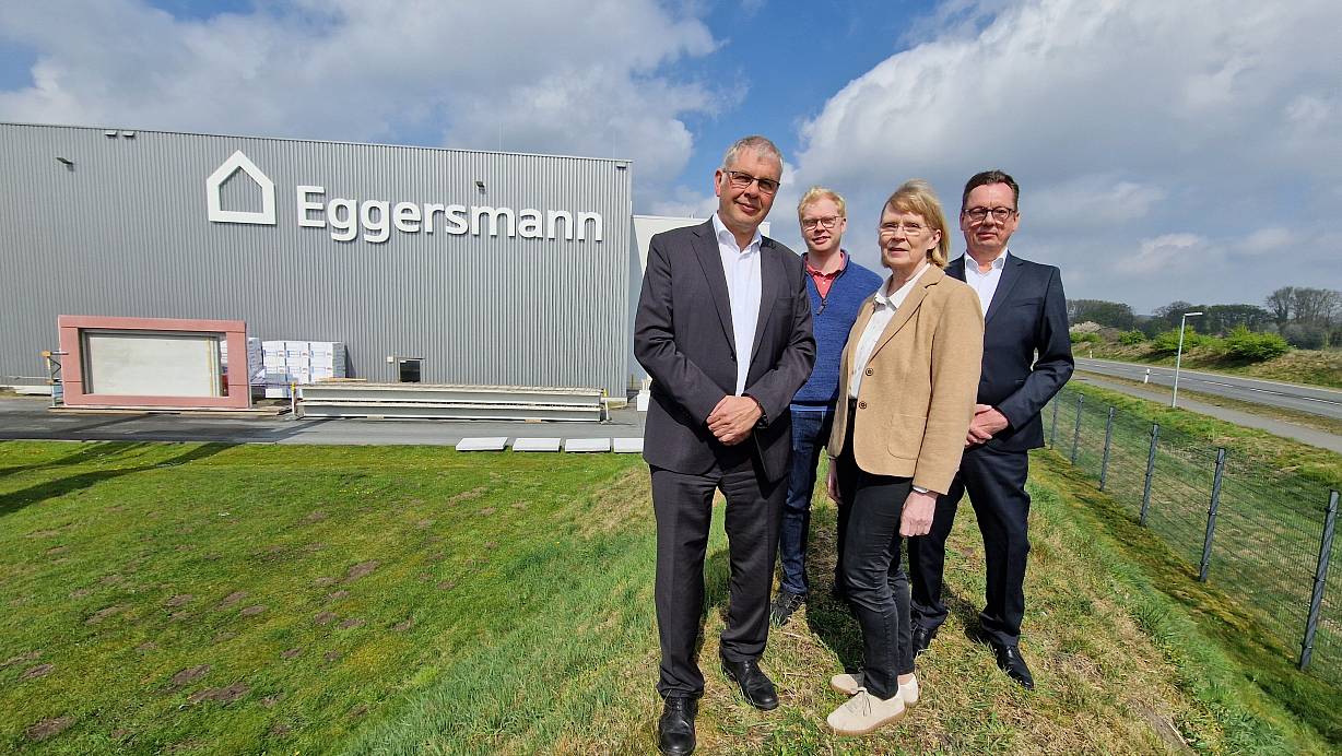 Karlgünter Eggersmann (Geschäftsführer Eggersmann Gruppe, v. l.), sein Sohn Matthias Eggersmann (Leitung Ingenieurbüro Eggersmann), Ehefrau Margarete Eggersmann (Leitung Ingenieurbüro Eggersmann) und Thomas Hein (Geschäftsführer Eggersmann Gruppe) vor dem Hauptstandort in Halle. | © Uwe Pollmeier