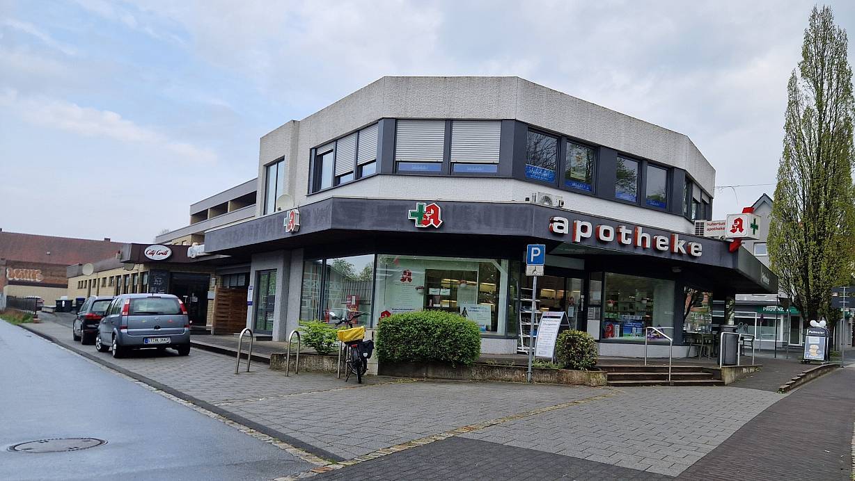 Die Hubertus-Apotheke in Halle an der Ecke Bahnhofstraße zwischen Bäckerei Pollmeier und Eiscafé La Stazione schließt am 28. Mai. | © Uwe Pollmeier