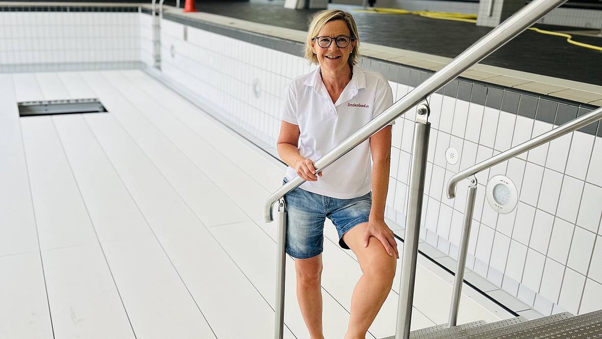 Während ihre Mitarbeiter während der Schließung des Lindenbads andernorts aushelfen, ist Badleiterin Birgit Johanning zumeist auf der Baustelle. Im Hintergrund: der höhenverstellbare Hubboden des Schwimmbeckens. | © Tobias Barrelmeyer
