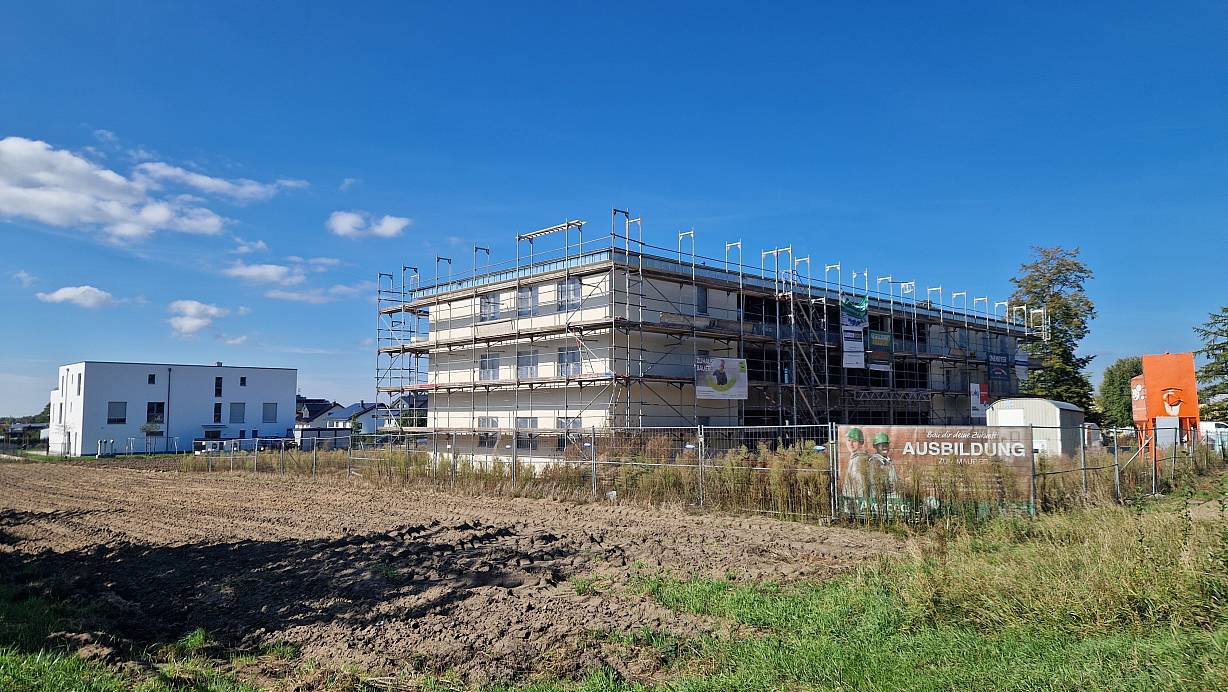 Der Neubau Sandkamp 24 mit zwölf öffentlich geförderten Mietwohnungen soll im Frühjahr 2026 fertiggestellt werden. Zwischen den beiden Gebäuden (links im Bild die Tagespflege der Diakonie) klafft noch eine Lücke. Dort wil die KWG auch noch bauen. | © Uwe Pollmeier