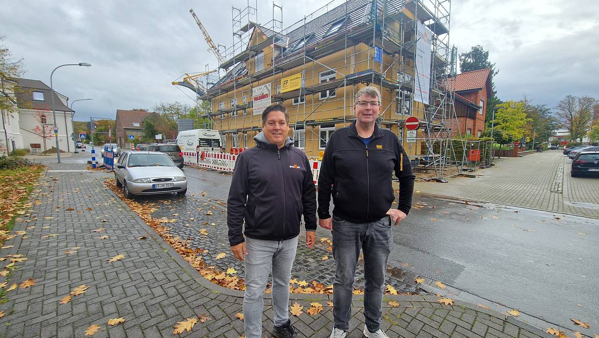 Für den Bau des neuen Mehrfamilienhauses an der Ravensberger Straße 10 hat Sven Ahlers (r.) erneut auf die Bauwerkstadt und deren Geschäftsführer Oliver Erdmann gesetzt. | © Uwe Pollmeier