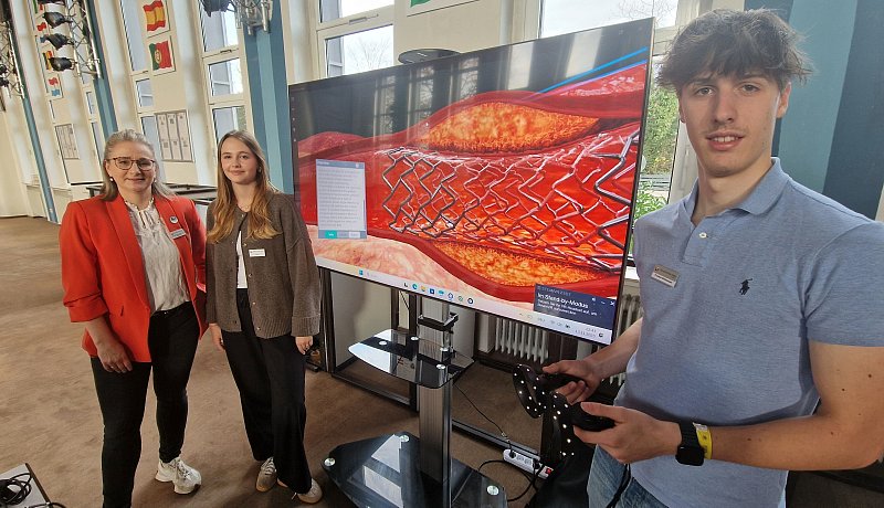 An einer der in der Aula des Berufskollegs aufgebauten Stationen zeigte Lehrerin Anja Philipp gemeinsam mit Schülerin Lara Lutze und Schüler Samuel Frantzen-Göhausen, wie man mithilfe von VR-Brillen den menschlichen Körper erkundet und sogar virtuelle Stents in verengte Blutgefäße einsetzt. „Ich kann mir gut vorstellen, Medizin zu studieren“, sagte Lutze, die sich in diesem Schuljahr im Endspurt zum Abitur befindet.