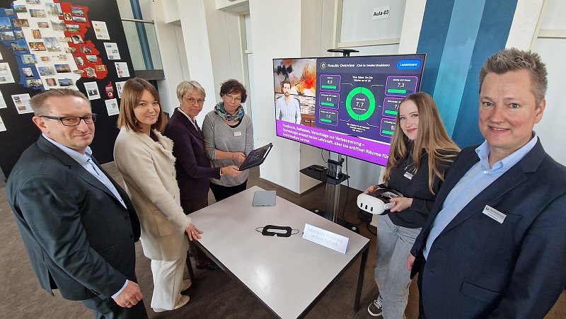Die Referendarin trainierte am virtuellen Speech-Trainer das Halten von Vorträgen. Mit einer VR-Brille auf dem Kopf trägt sie ihren Text vor, der Computer erfasst dabei ihre Blickrichtungen, die Zeit des Augenkontakts und registriert alle Füllwörter, wie „ähm“ oder „genau“. „Am Anfang hatte ich bei einem rund zehnminütigen Vortrag 70 Mal ’ähm’ gesagt, nun sind es, bei einer etwas kürzeren Zeit, nur noch 17“, verwies Schulmeister auf erste Lernerfolge.