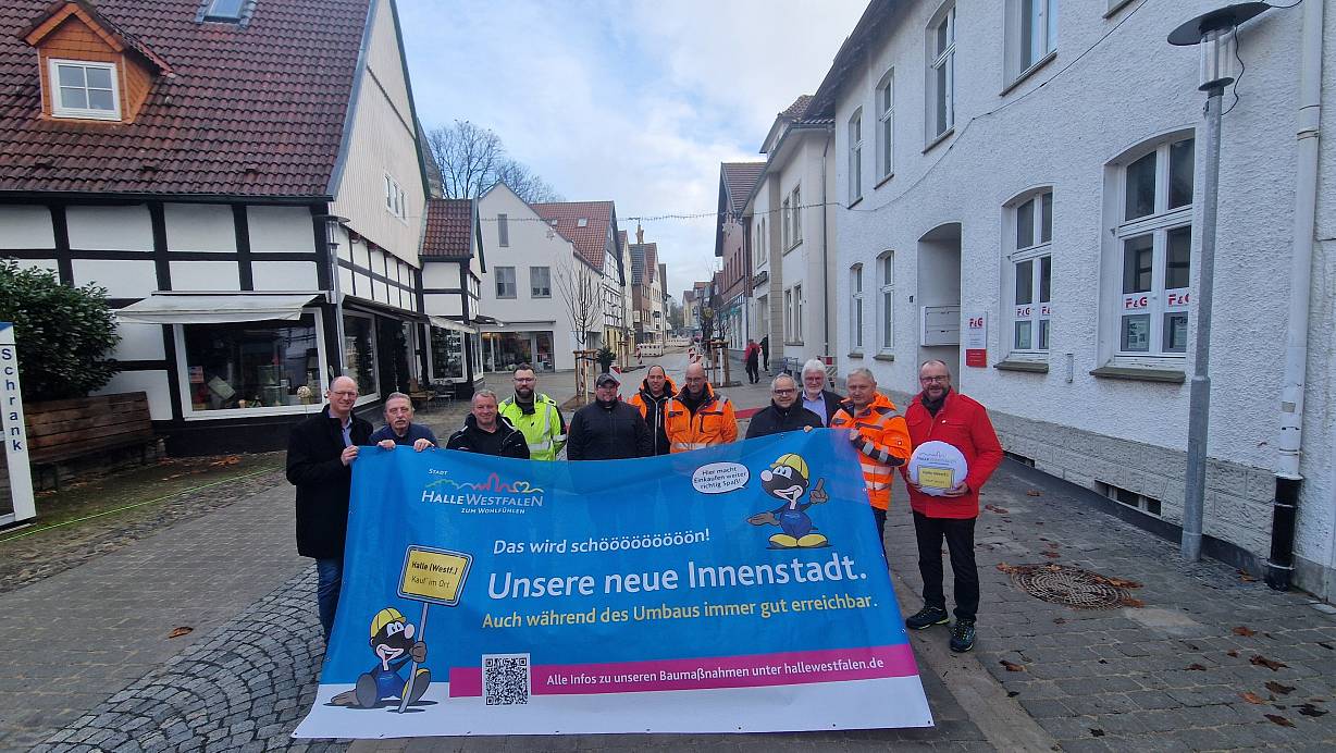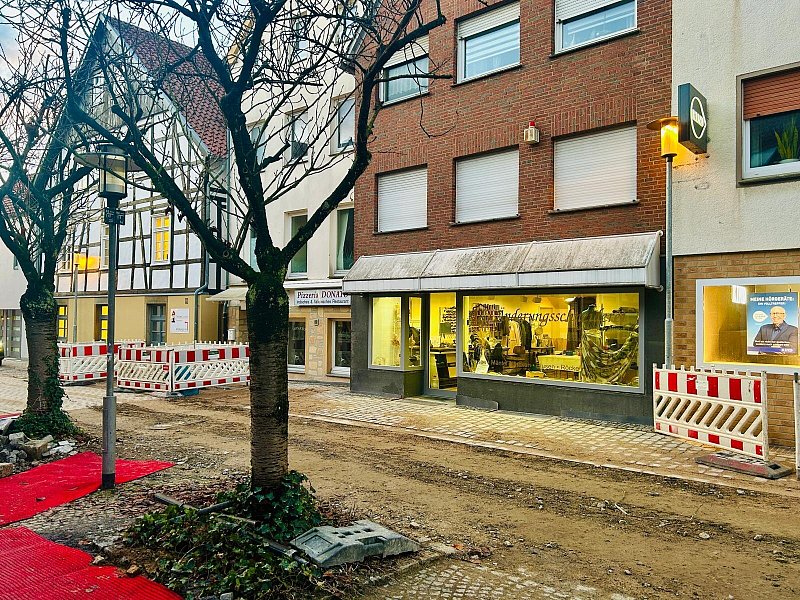 HIW-Vorsitzender Dieter Büsselberg bewertete das Zwischenergebnis ebenfalls positiv. „Das sieht alles top aus.“ Schade sei aber, dass die Weihnachtsbeleuchtung bei „Stoffe im Trend“ ende und die Straße danach sehr dunkel sei. Dies hängt, wie Pohlan erklärte, damit zusammen, dass die für die Weihnachtsbeleuchtung über die Straße gespannten Drahtseile dort noch nicht wieder angebracht wurden. Sie seien entfernt worden, damit der Bagger durchfahren konnte. Dieser werde aber in Kürze noch einmal im Einsatz sein, und die Zufahrt über die Blümchengasse sei aufgrund der Größe und Schwere des Fahrzeugs nicht möglich. Büsselberg regte an, einige weihnachtliche Beleuchtungselemente in Bodennähe zu installieren. Bauamtsleiter Manfred Bonensteffen versprach, sich der Sache anzunehmen.