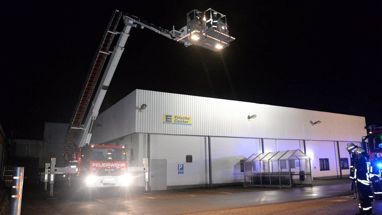 Das weitläufige Gebäude wurde zunächst umstellt, später wurden Polizeibeamte mit dem Teleskopmast auf das Dach gefahren, um nach Verdächtigen zu suchen. Das war aber nicht so einfach, wie zunächst gedacht: „Das Dach sieht vom Boden aus wie ein Flachdach, ist es aber nicht", berichtete Feuerwehr-Einsatzleiter Andreas Kramme. Auf dem Dach sind Erhöhungen in Form eines Dreiecks, so dass ein möglicher Einbrecher sich hier gutverstecken kann. Die Feuerwehrleutepostierten ihre Fahrzeuge rund um das Gelände und leuchteten die Einsatzstelle mit ihren Strahlern aus.