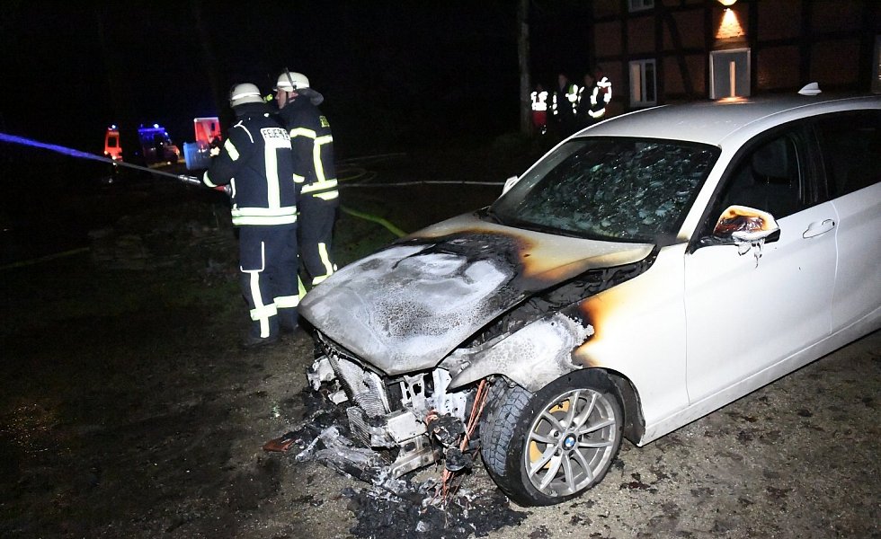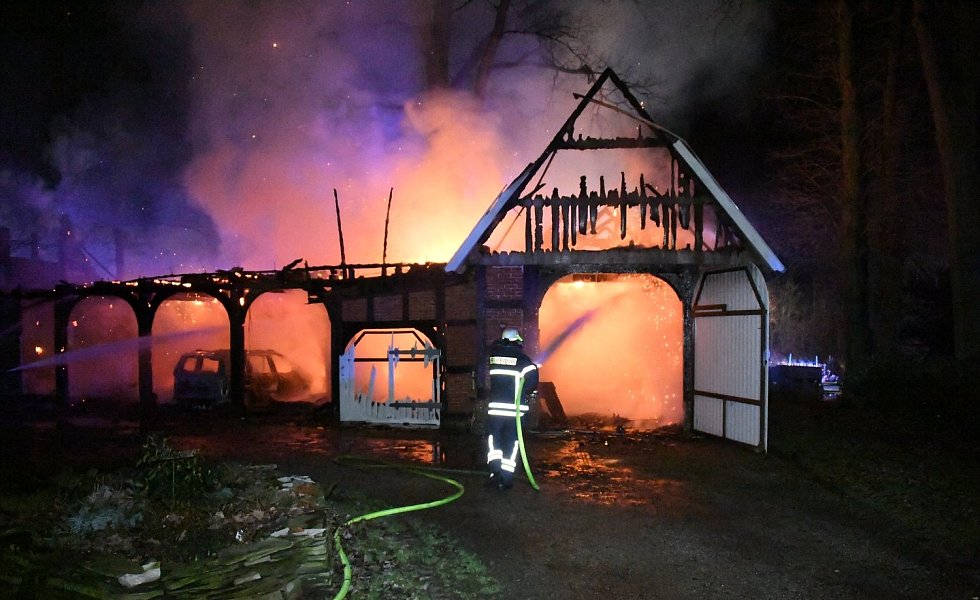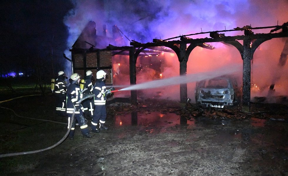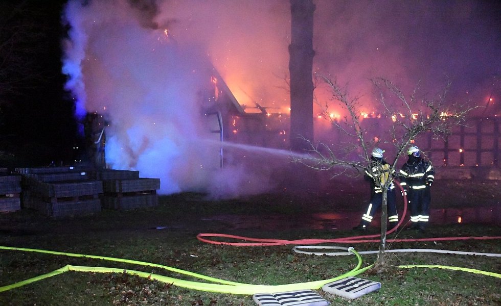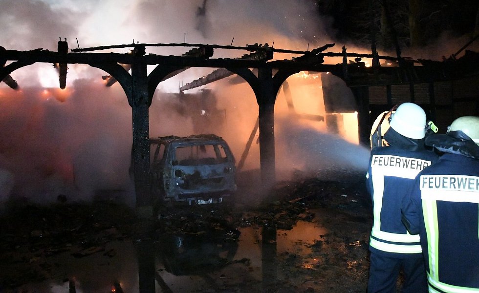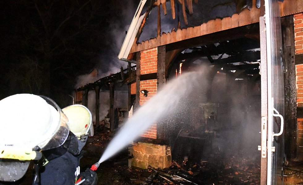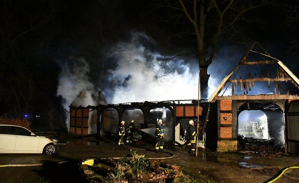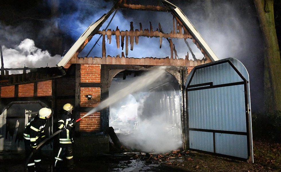 Aus zwei B- und vier C-Rohren wurde der Brand schließlich von allen Seiten bekämpft und eingedämmt. Nicht verhindern konnten die Feuerwehrleute, dass ein 1er BMW sowie ein VW Touran in der Scheune ebenso völlig zerstört wurden wie mehrere Fahrräder.