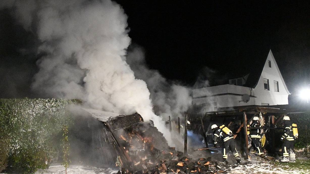Während an den Fahrzeugen erheblicher Schaden entstanden war, ist ein ebenfalls in der Garage abgestelltes Motorrad völlig zerstört worden. Rund ein dutzend Feuerwehrleute mussten sich mit Atemschutzgeräten ausrüsten, um sich vor den giftigen Brandrauch zu schützen. Nachdem die Feuerwehrleute den Brand unter Kontrolle hatten, musste das aufgestapelte Holz auseinandergezogen und einzeln abgelöscht werden. Dabei wurde auch Schaummittel eingesetzt, um letzten Glutnestern den Sauerstoff zu entziehen.