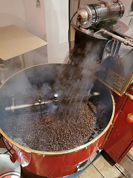 „Bier hätte man hier nicht brauen können", sagt er lachend. Dafür entstünden beim Brauen zu üble Gerüche. Röstfrischer Kaffee riecht zwar nicht wie Kaffee, der Geruch ist aber angenehmer und treibt Leute in den Laden. „Früher habe ich immer um 6 Uhr geröstet und dann die Fenster geöffnet.
