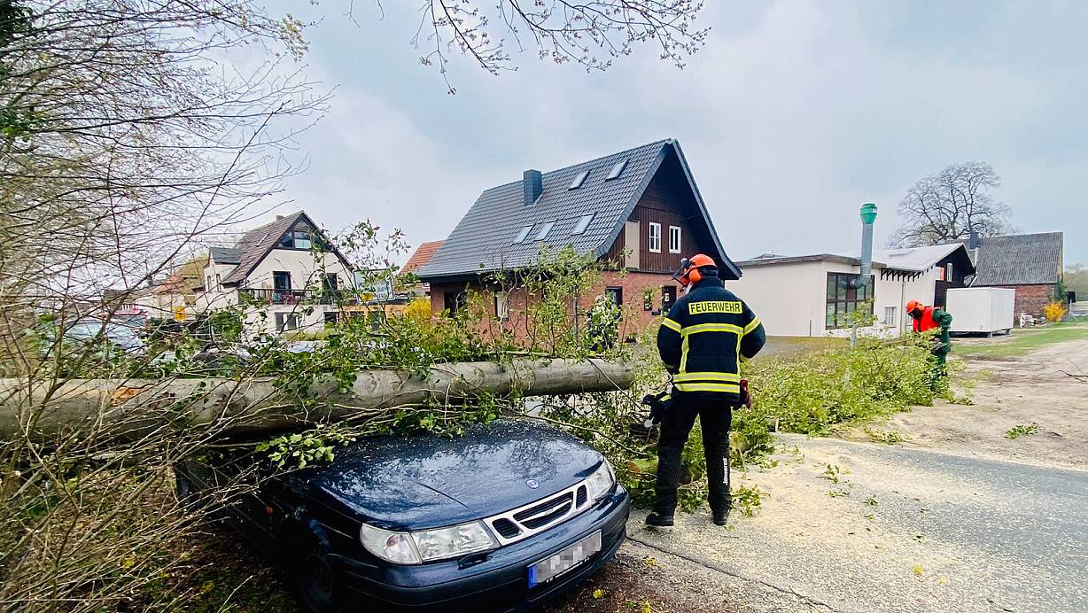 Die Löschzüge Amshausen und Steinhagen wurden alarmiert und beseitigten den Baum. Wie Einsatzleiter Sven Mescher am Montag, 4. April, erläuterte, gehört das Auto einem Anwohner. „Das Dach des Saabs war total eingedrückt; das ist ein wirtschaftlicher Totalschaden", so Mescher.
