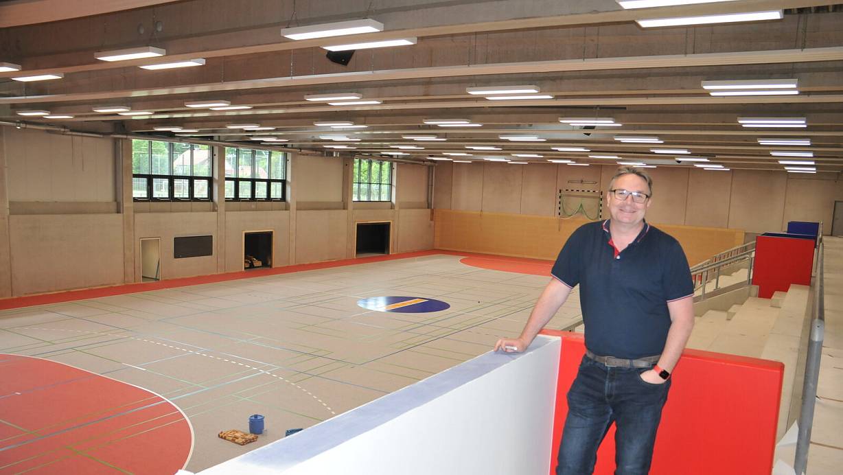 Vereinsvorsitzender Andreas Wessels in der Dreifachsporthalle. Das gesamte Sportzentrum verfügt über 3.500 Quadratmeter Nutzfläche. Die sieben in unterschiedlichen Farben angestrichenen Säulen im Hintergrund stehen für die sieben Abteilungen der Sportvereinigung. | © Frank Jasper