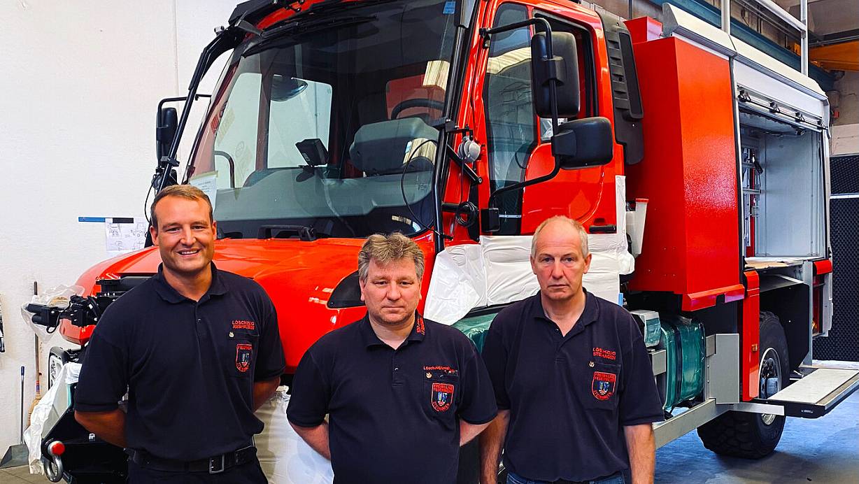 Amshausens stellvertretender Löschzugführer Sven Mescher (von links), Löschzugführer Dirk Bergmann und Steinhagens Feuerwehr-Chef Lutz Mescher vor dem neuen Löschfahrzeug. | © Feuerwehr Steinhagen