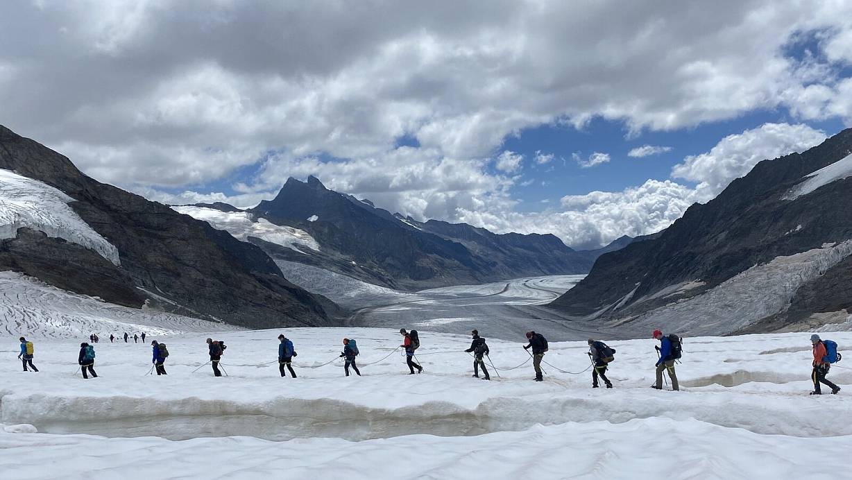 Mit Steigeisen unter den Füßen und durch ein Seil miteinander verbunden macht sich die Gruppe auf den Weg. Die zweitägige Tour über den Aletschgletscher kann im Internet gebucht werden. Muskelkater und unbezahlbare Ausblicke inklusive. | © Anja Runge