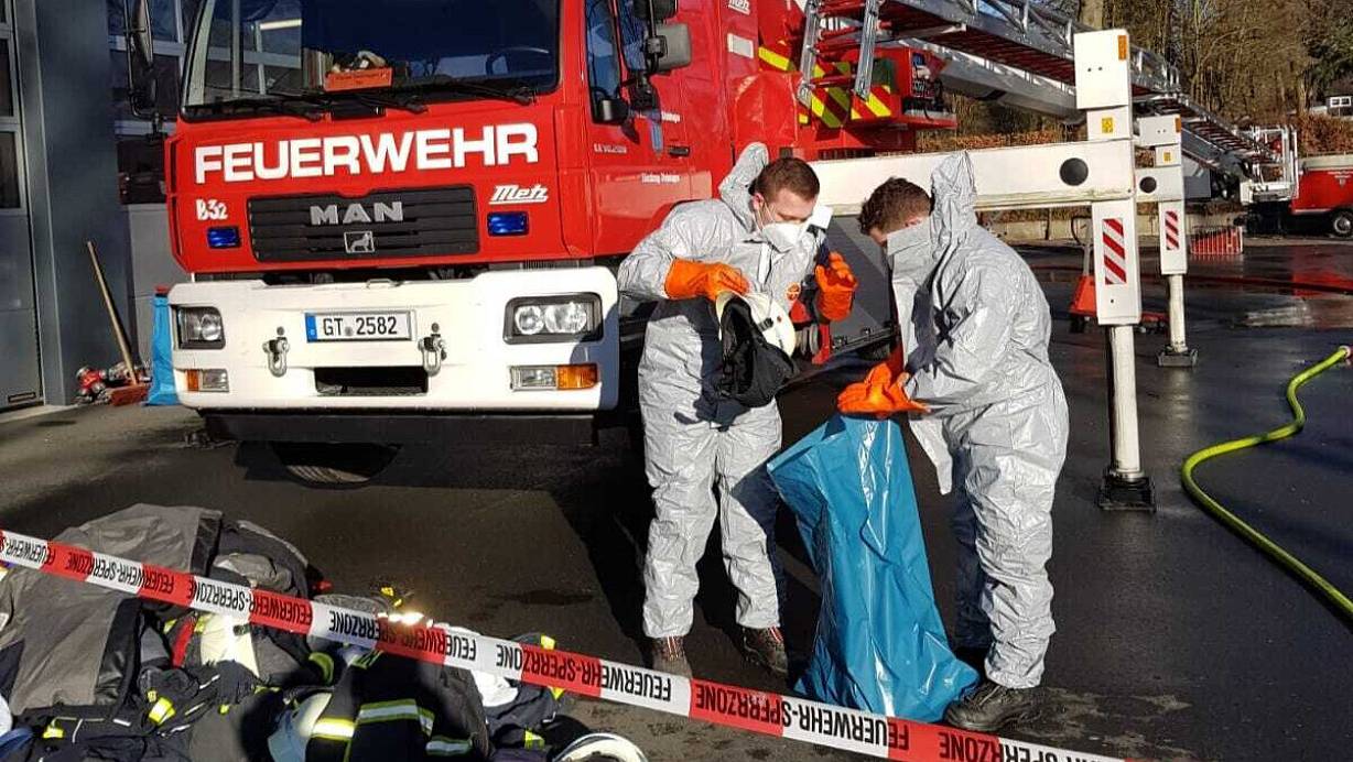 Personal in Schutzanzügen verpackt kontaminierte Schutzkleidung zum Abtransport in Säcke. | © HK