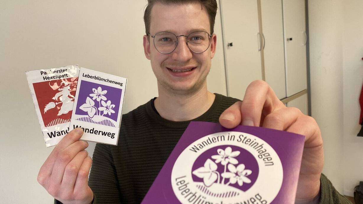 Dominic Rudek, im Rathaus unter anderem für den Tourismus zuständig, hat Aufkleber zum Leberblümchenweg und zum Hexenpatt drucken lassen. | © Frank Jasper