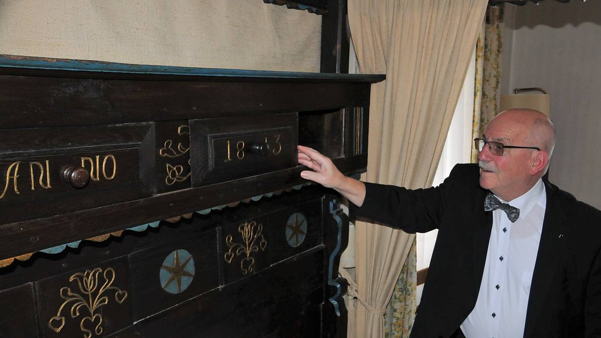 Seit 1976 arbeitet Eddy Hufenbach im Hotel. Er kennt jeden Winkel des Hauses. Hier zeigt er ein Geheimfach im Himmelbett im historischen Brautzimmer. Auf dem Holz ist in goldener Schrift das Entstehungsjahr des antiken Möbelstücks zu erkennen: Anno 1813. | © Frank Jasper