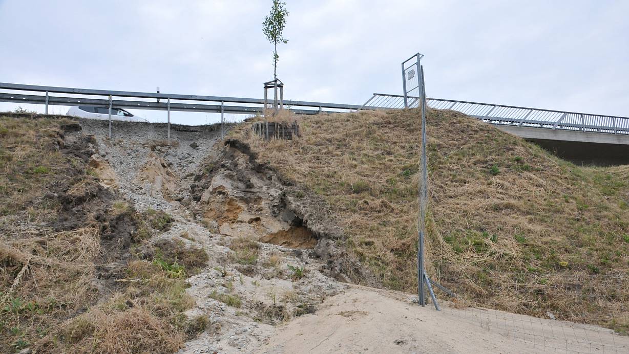 Die Autobahnbrücke Queller Straße ist an einer Stelle stark beschädigt. Die Böschung ist bis zur Fahrbahnkante abgerutscht. | © Frank Jasper