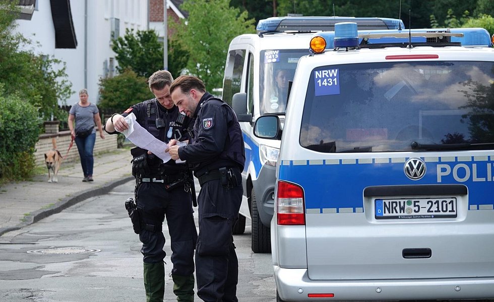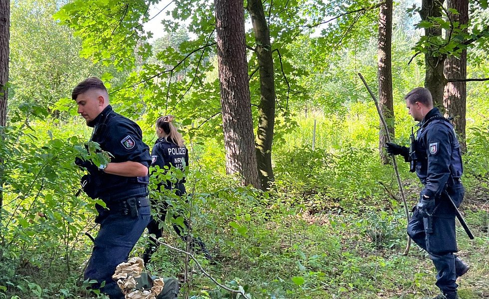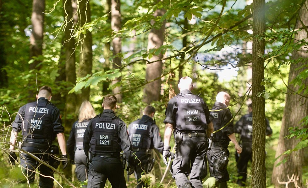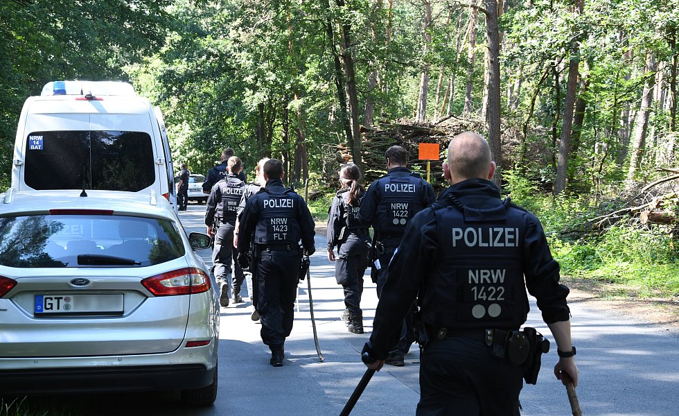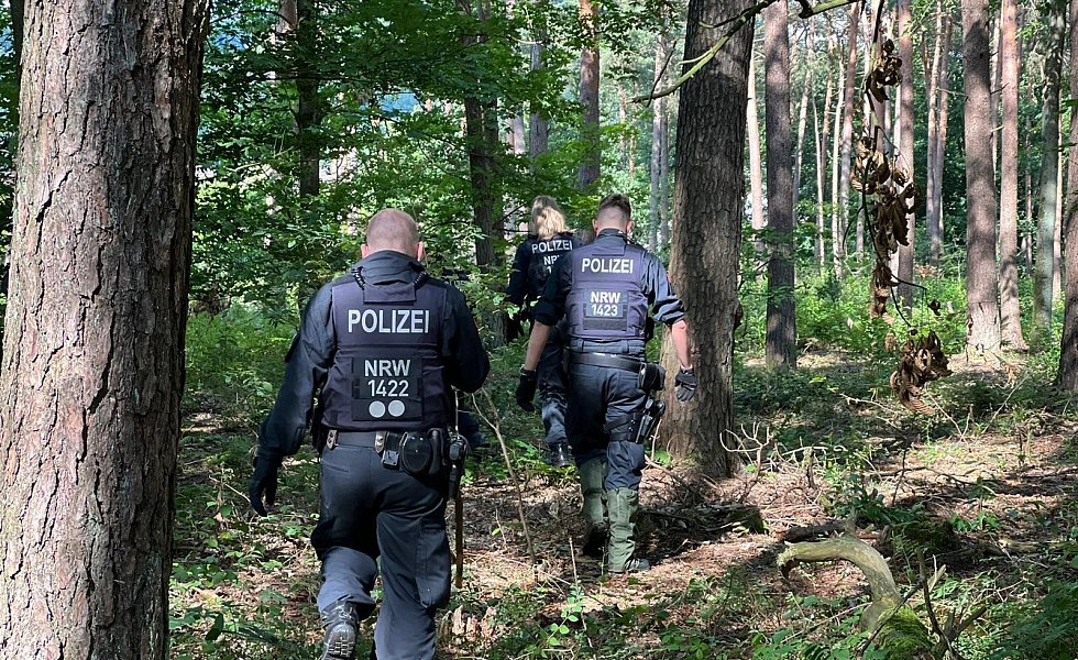 Zur Durchsuchung größerer Waldgebiete und auch eines Gewässers waren am Donnerstagmorgen und -nachmittag neben Gütersloher und Bielefelder Beamten auch Beamte aus Bereitschaftspolizei, Hundertschaften und die Feuerwehr des Kreises Gütersloh im Einsatz. Dabei unterstützten Taucher der DLRG.