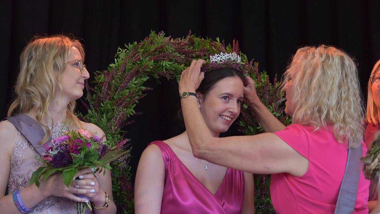 Für Sara II. (l.) ist die Amtszeit zu Ende. Kerstin Abraham (r.). krönt die neue Heidekönigin Lilith I. | © Birgit Nolte