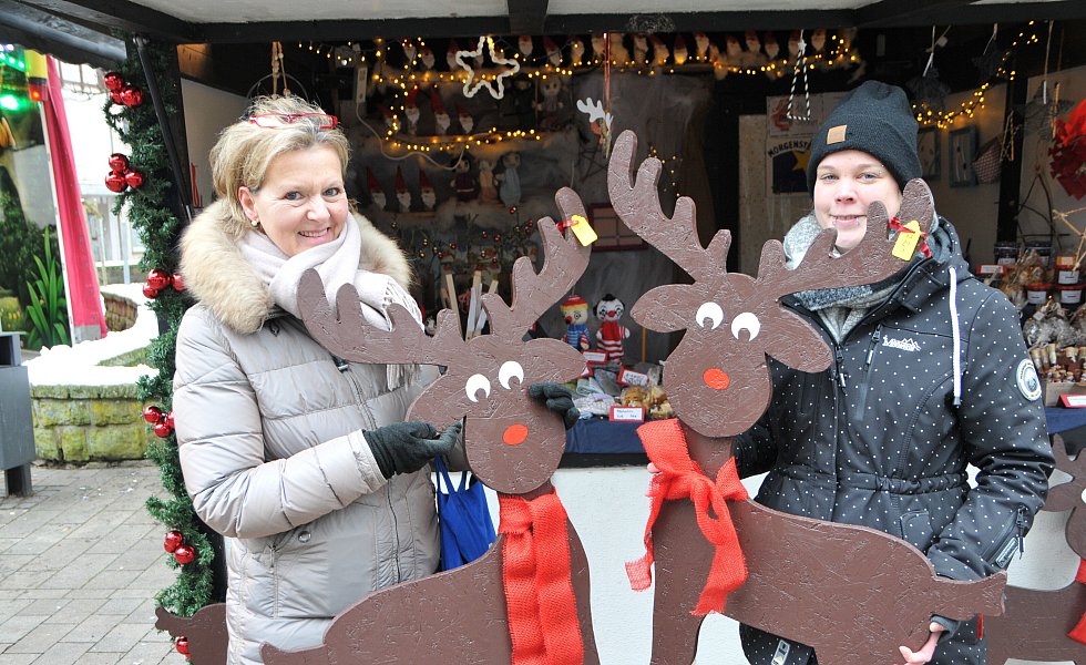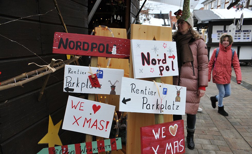 So ein Weihnachtsmarkt eignet sich bekanntlich auch immer gut zum Geschenke-Shoppen. Echt witzig sind die Wegweiser, die es am Stand der evangelischen Kindergärten gibt. Zu finden ist der Stand auf dem nördlichen Kirchplatz. Wo bitte geht’s zum Nordpol oder zur Elfen-Werkstatt? Wer passend zum Schild „Rentier-Parkplatz" das passende Rentier haben möchte, wird wenige Meter weiter fündig. In dem Holzhäuschen, das sich die Kitas Ströhen und Brockhagen teilen, stehen sie ausgesägt aus Holz und mit rotem Schal und warten auf Käufer.