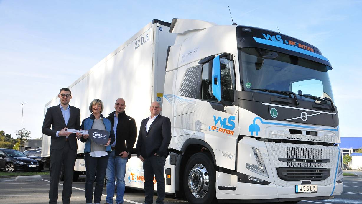 Im November 2023 feierten WLS-Junior-Chef Jannik Leimkuhl (v. l.), Susanne Bohle (Verkaufsleiterin Volvo-Partner Wesle), Patrick Schildmann (Serviceberater Wesle) und Frank Wohlgemuth (WLS-Standortleiter Bielefeld) den neuen E-Lkw. | © Frank Jasper