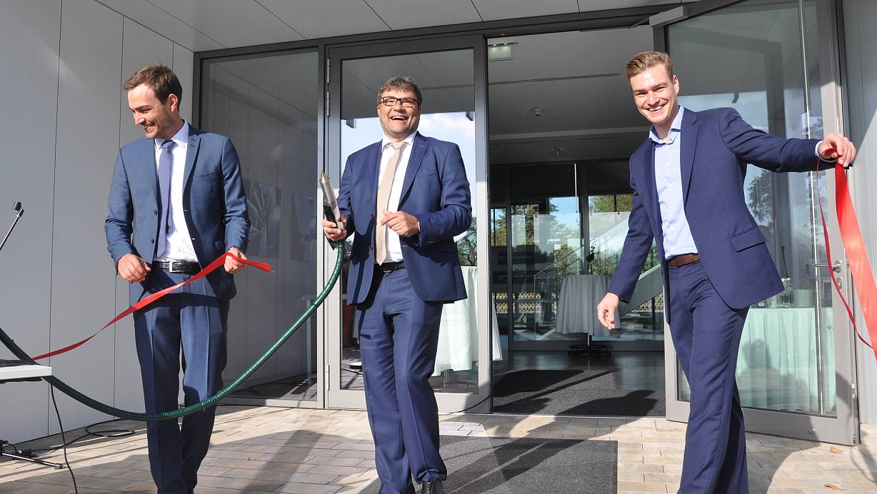Magnus Buske (v. l.), Firmengründer Christian Buske und Lukas Buske 2019 bei der Eröffnung des neuen Forschungs- und Entwicklungszentrums an der Queller Straße. | © Sonja Faulhaber