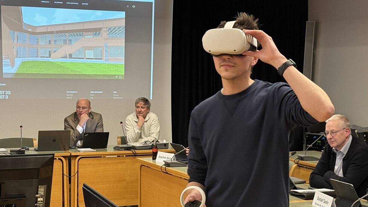 Moritz Michael Engel von der SPD sieht durch die VR-Brille bereits die neuen Schulgebäude am Steinhagener Gymnasium. | © Frank Jasper
