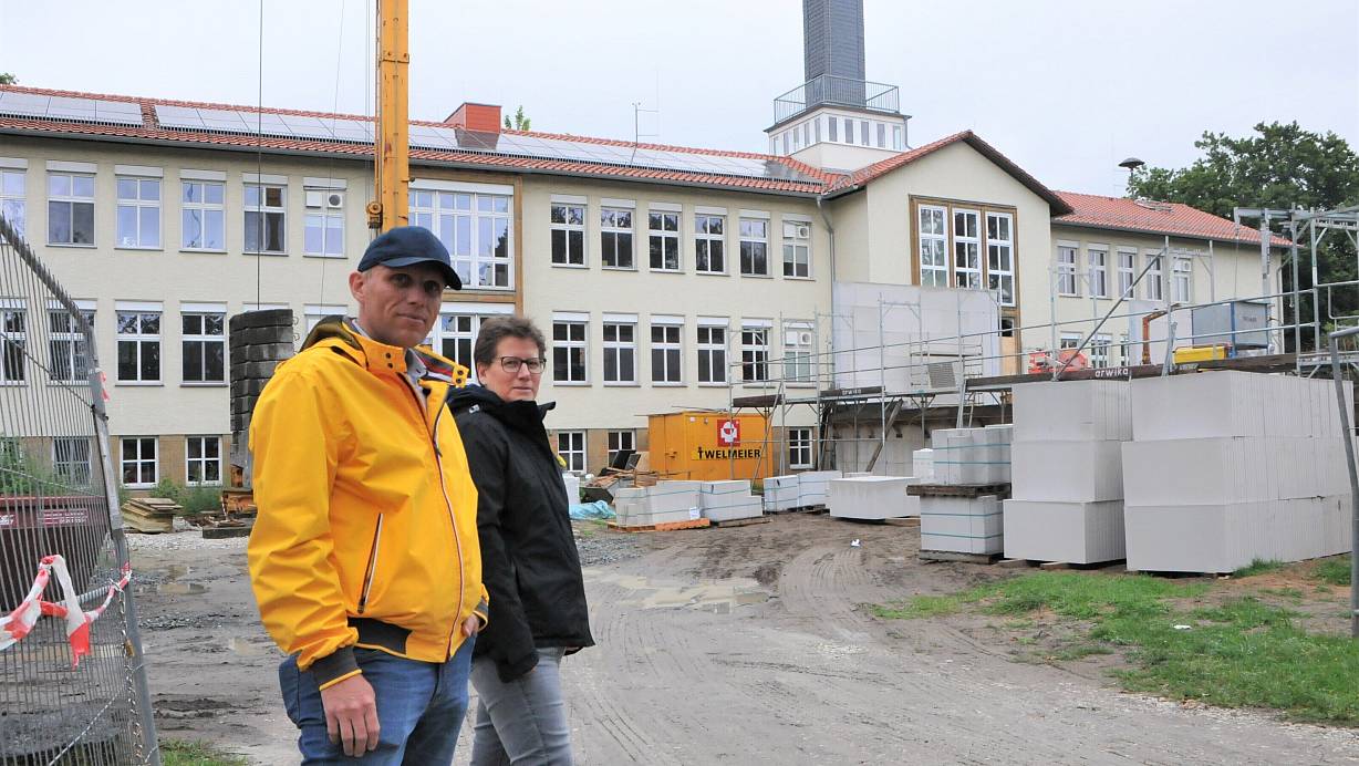 Sebastian Klopfer und Christina Hagemann vom Gebäudemanagement der Gemeindeverwaltung an der Grundschule Steinhagen. Das Gebäude bekommt einen Anbau, der im Frühling nächsten Jahres fertig sein soll. | © Frank Jasper