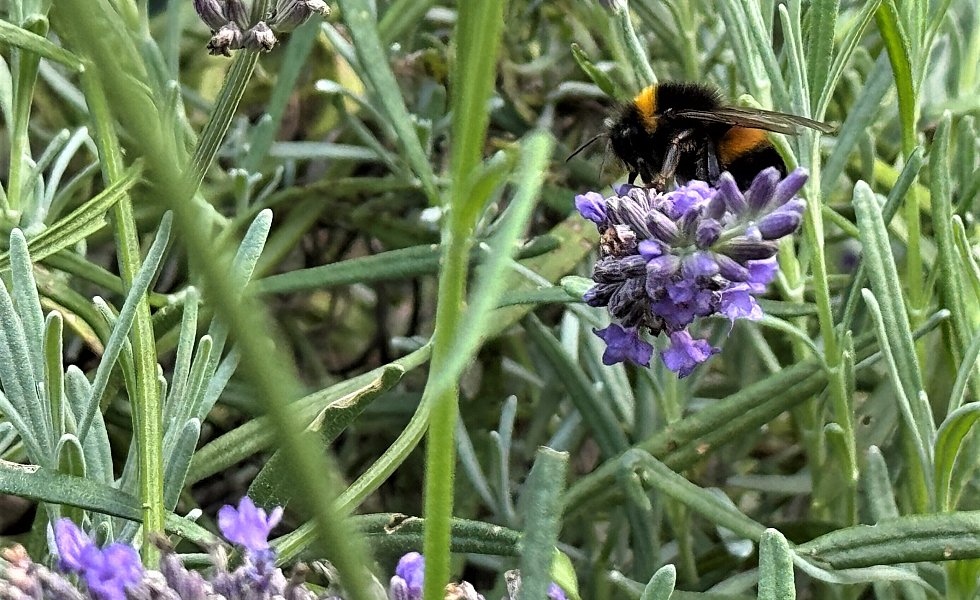 Sehen, riechen, schmecken – im Garten von Petra Bach werden alle Sinne angesprochen. Auch zu hören gibt es was. Neben der Terrasse plätschert ein kleiner Brunnen. Wirklich winzig ist das Wasserspiel, aber es erfüllt hervorragend seinen Zweck. Zusammen mit den brummenden Bienen, die über den Lavendel-Stauden zum Landeanflug ansetzen, sorgt der Brunnen für den entschleunigenden Sound im Paradies.