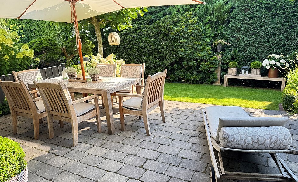 Die Waschbetonplatten, aus denen die Terrasse ursprünglich bestand, gehörten auf jeden Fall nicht dazu. „Das Haus stammt aus den 1970er Jahren. Damals waren die Waschbetonplatten noch angesagt“, erzählt Petra Bach schmunzelnd, während sie auf der inzwischen neu gepflasterten Terrasse Kaffee serviert. „Ich habe das Haus 2007 gekauft und den Garten Stück für Stück umgestaltet.“