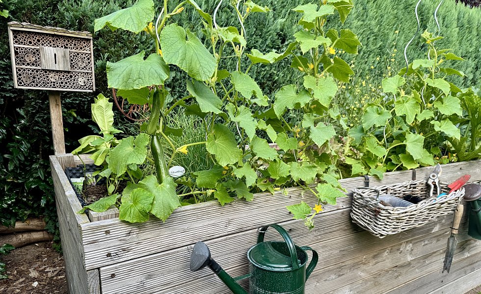 Hinter dem 70er-Jahre-Bungalow hat Petra Bach ein Hochbeet aufgestellt, mit dem sie dem trockenen Sandboden auf dem Grundstück ein Schnippchen schlägt. „Ich habe mir Mutterboden vom Kompostwerk in Gütersloh geholt und damit das Hochbeet befüllt. Jetzt gedeihen hier Gurken, Salate und Zucchini“, zählt sie auf. Die Mirado-Tomaten sind gerade reif. Petra Bach pflückt eine und steckt sie sich in den Mund: „Der perfekte Snack für zwischendurch.“ Für die Bestäubung der Pflanzen sind die fleißigen Bienen zuständig, die praktischerweise gleich nebenan wohnen. Die Gartenbesitzerin hat ein Insektenhotel ans Hochbeet gebaut.