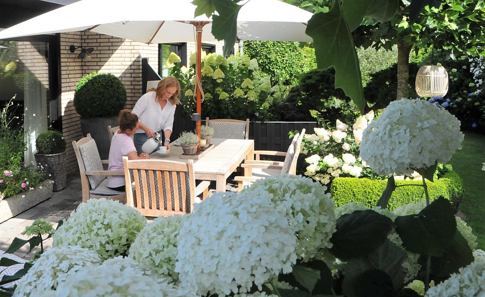 Auch in dieser Ecke des Gartens faszinieren Hortensien mit ihren riesigen Blütenbällen. „Ich verwende Sorten wie Limelight und Vanille-Fraise“, verrät Petra Bloch. „Im Frühjahr schneide ich sie etwas zurück.“ Wer sich umschaut, entdeckt in ihrem Garten neben Grün vor allem zwei weitere Farben: weiß und blau. Neben den geschwungenen Linien verleiht vor allem diese reduzierte Farbgebung dem Garten Struktur. Außerdem strahlt die farbliche Zurückhaltung Ruhe aus. Glück für den Hibiskus, der schon vor dem Hauskauf hier wuchs. „Der blüht weiß und durfte darum natürlich bleiben“, stellt Petra Bach augenzwinkernd klar.