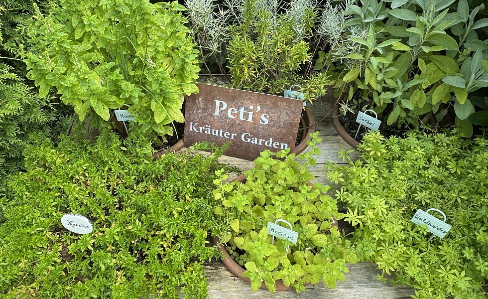 Für paradiesische Momente sorgt der Garten auch in der Küche. Denn Petra Bach dient er nicht nur zur Zierde, sie baut auf ihrem Grundstück in überschaubarem Rahmen Obst, Gemüse und Kräuter an. Clever: In eine Holzplatte hat sie runde Löcher gesägt, in denen jetzt Blumentöpfe stecken. Auf diese Weise ist ein pflegeleichter Kräutergarten entstanden. Dort wachsen Melisse, Rosmarin, Salbei, Minze, Thymian und vieles mehr.